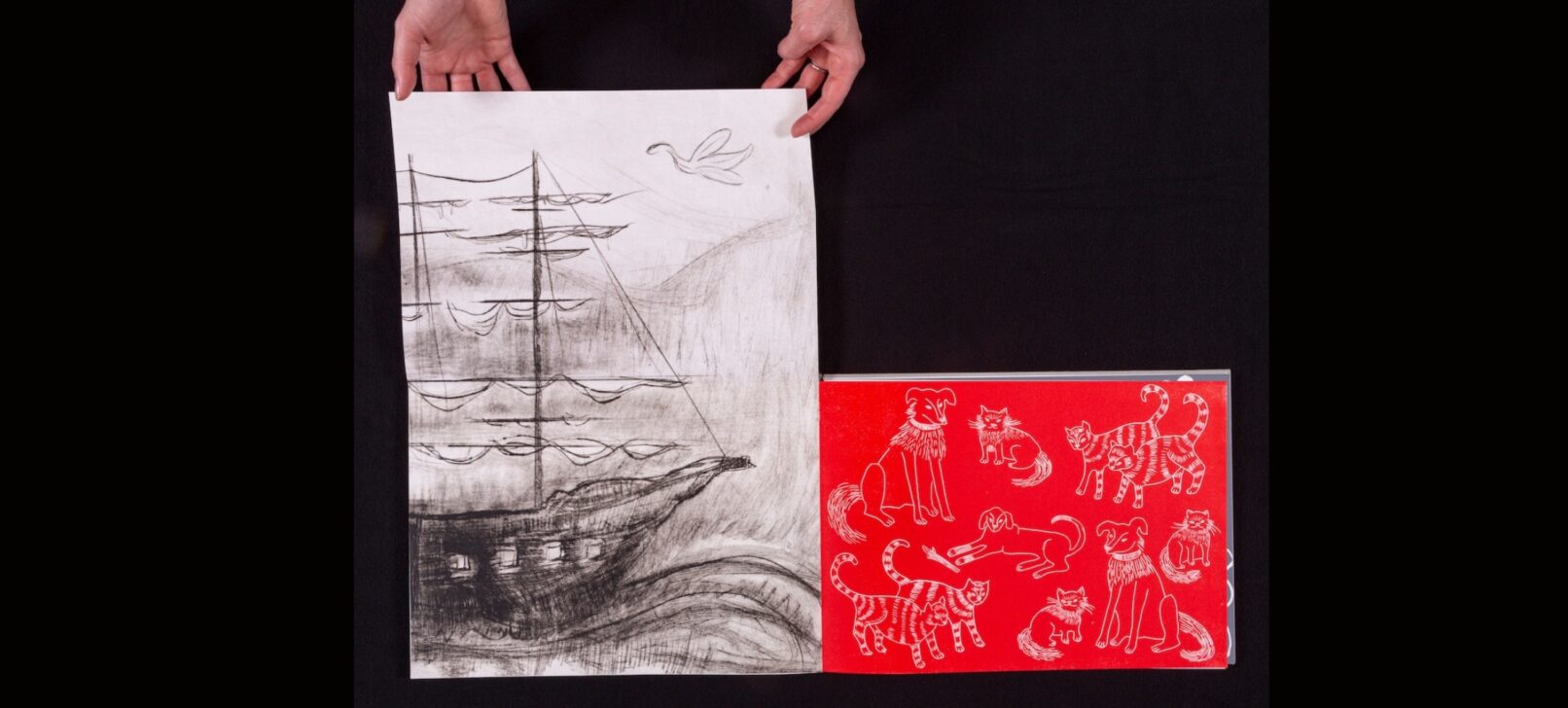 Though Millie is remembered as a solitary figure who lived a reclusive life in her off-grid, rustic farmhouse, when we visited her home, she seemed far from alone. She was a collector of pets, plants, rocks, wallpapers, and more. On the second floor of the house, images of boats and sea creatures, previously covered by wallpaper, are scratched (sgraffitto) into the walls, left there before the Pettengils moved in by an unknown artist.