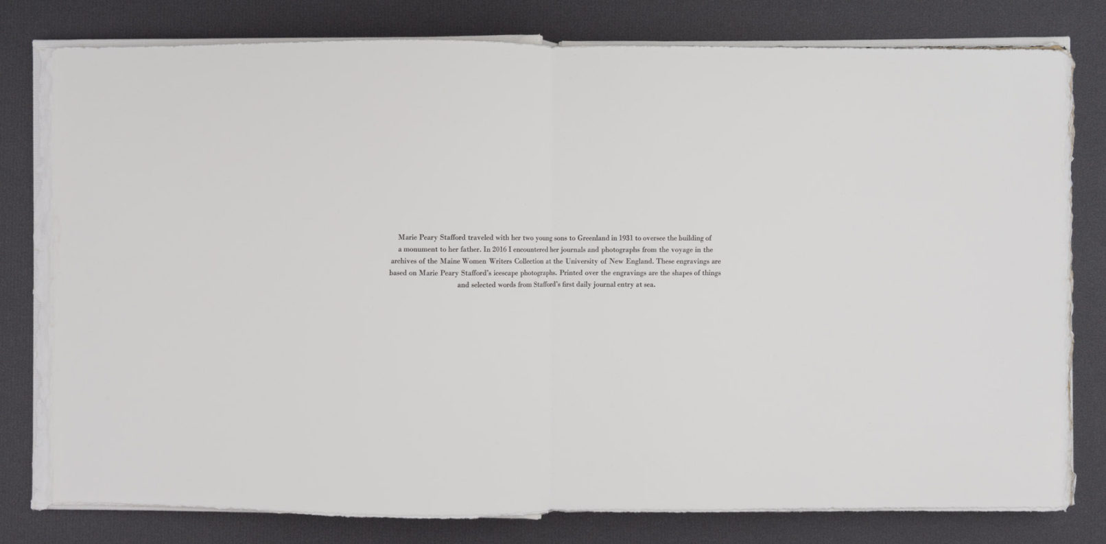 Iceblink is an artist’s book that responds to archival materials documenting Marie Peary Stafford’s 1932 voyage to Greenland to oversee the construction of a monument to her father, explorer Robert Peary. Through this project, I investigate the entanglements of U.S. colonial imagination, whiteness, and knowledge production—alongside my own relationship to these systems as an artist, teacher, and white woman.