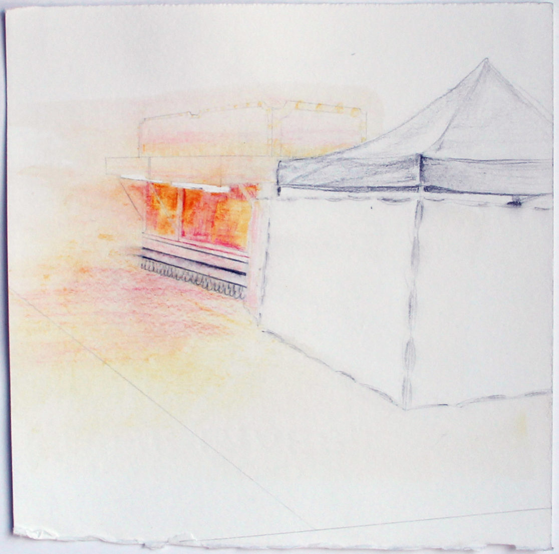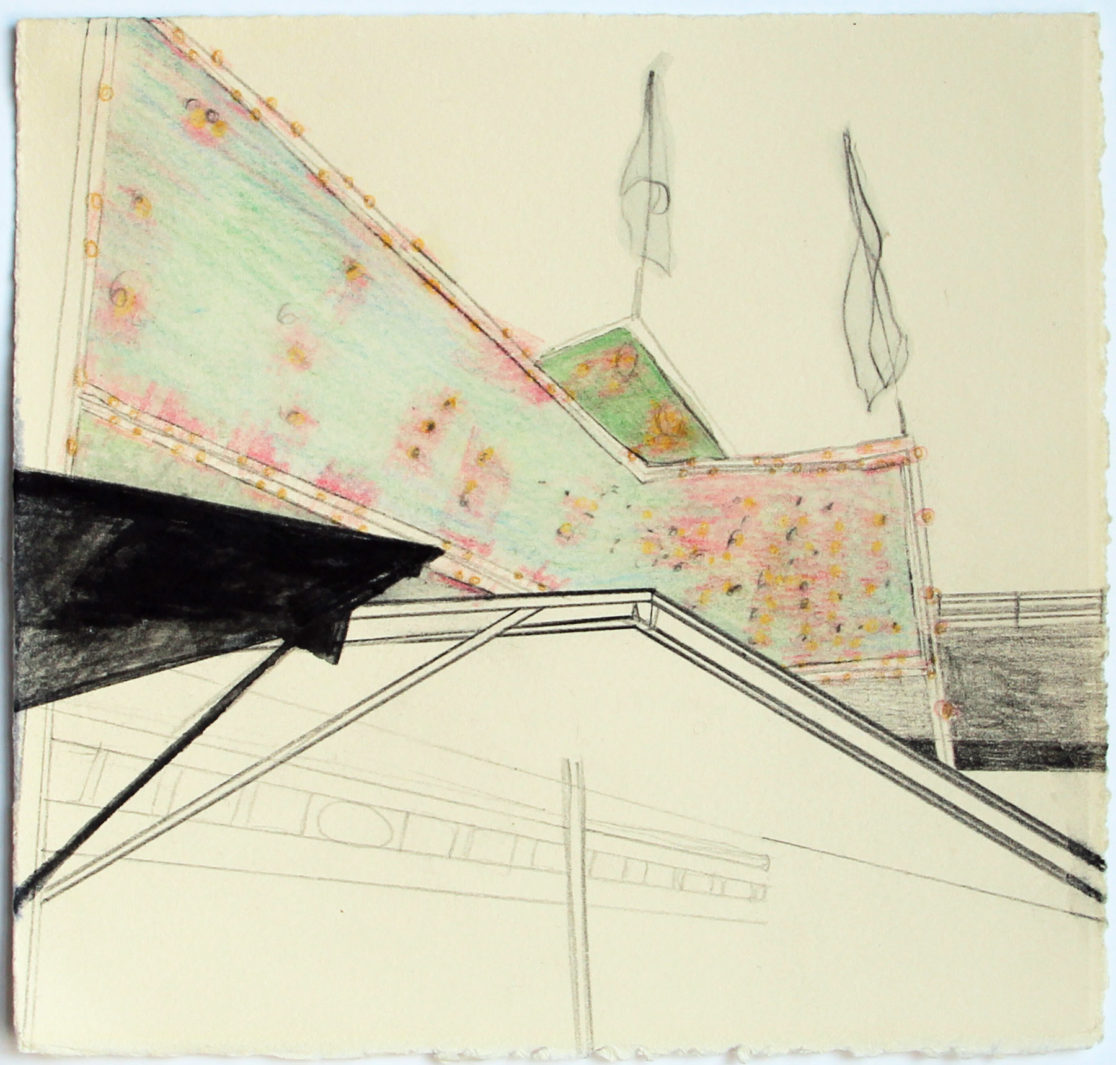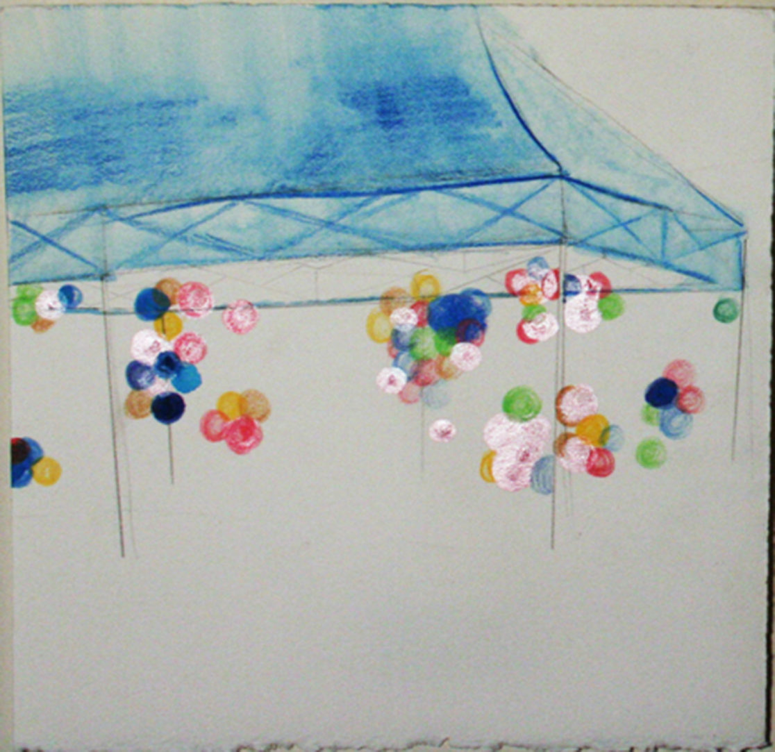 My work in printmaking and paper installations invites viewers to share an experience of particular physical places that are freighted with uncanny memory and conjure up a powerful sense of place. I’m especially drawn to spaces that hold the memory of an event or time, spaces that are imagined, remembered, emptied-out, or waiting-to-be-filled: a fair ground for an annual festival, a drive-in movie screen in winter, or a ski lift in summer. These small drawings describe the street fairs I encountered during a summer of travel between Salina, Kansas, my home in Maine, my hometown in Pennsylvania, and Almería, Spain.