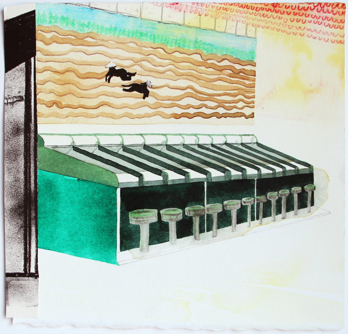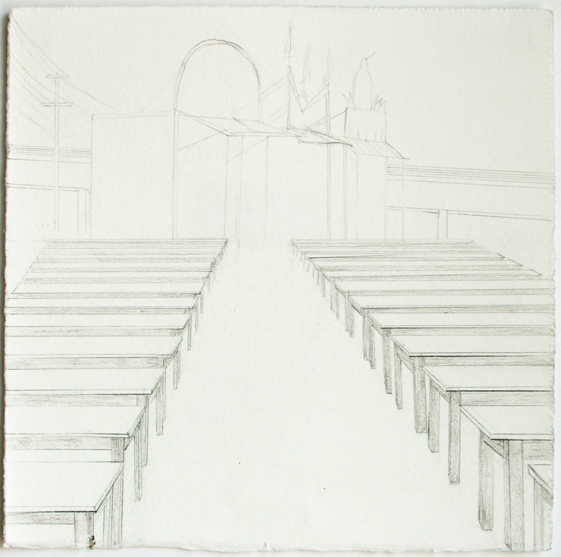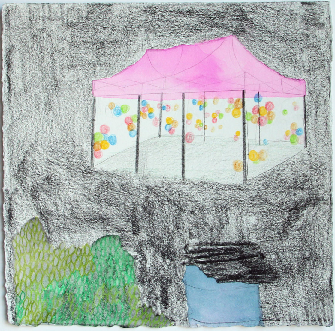 My work in printmaking and paper installations invites viewers to share an experience of particular physical places that are freighted with uncanny memory and conjure up a powerful sense of place. I’m especially drawn to spaces that hold the memory of an event or time, spaces that are imagined, remembered, emptied-out, or waiting-to-be-filled: a fair ground for an annual festival, a drive-in movie screen in winter, or a ski lift in summer. These small drawings describe the street fairs I encountered during a summer of travel between Salina, Kansas, my home in Maine, my hometown in Pennsylvania, and Almería, Spain.