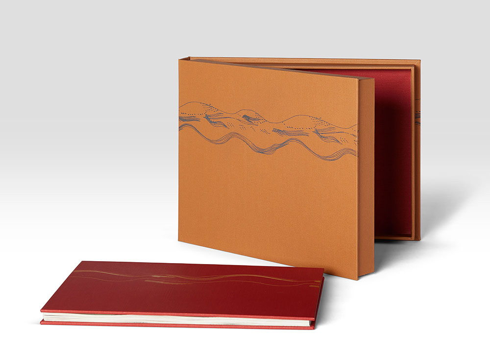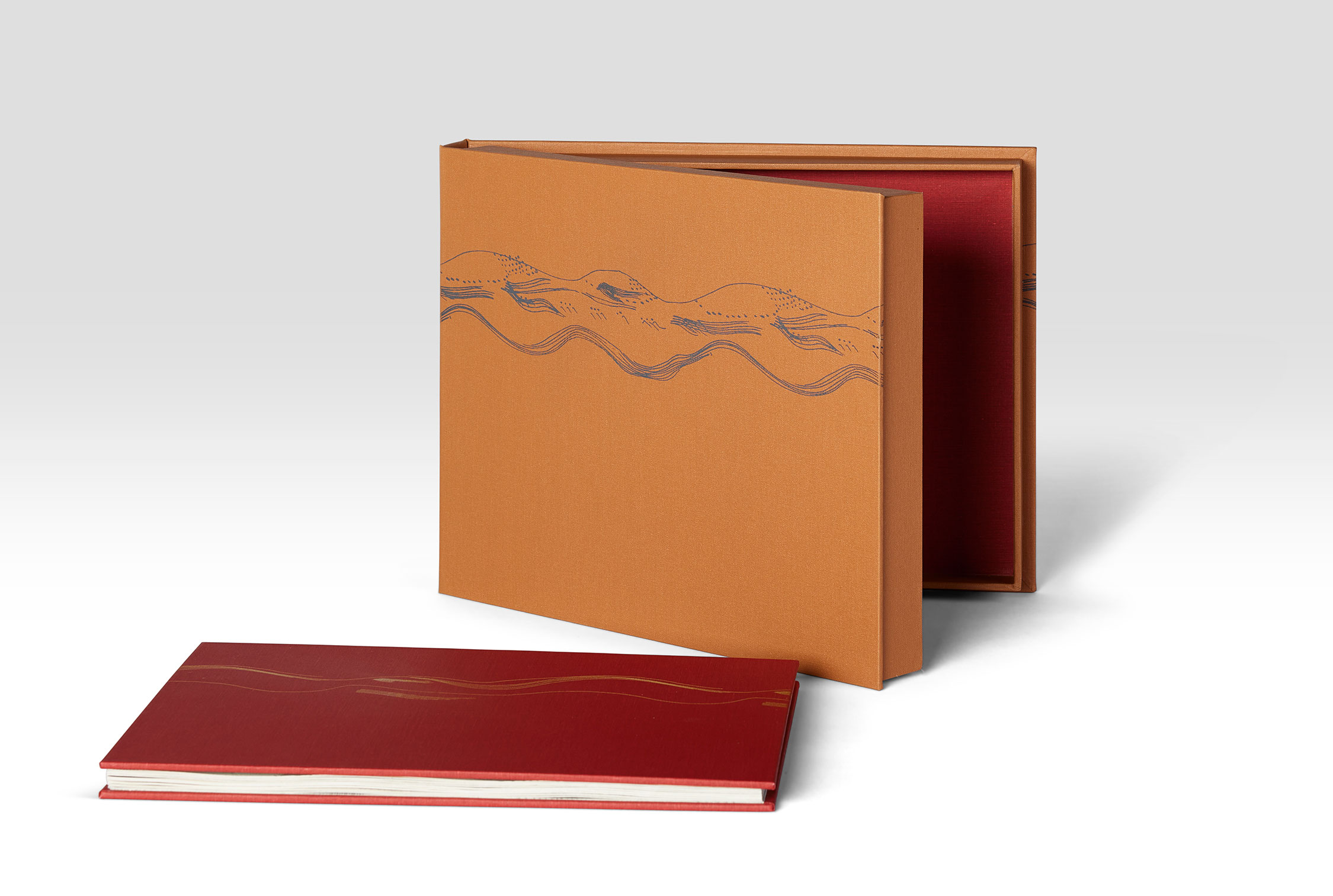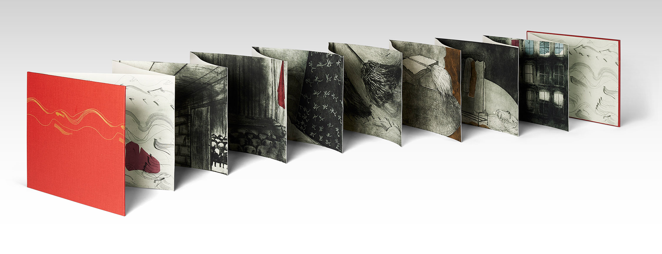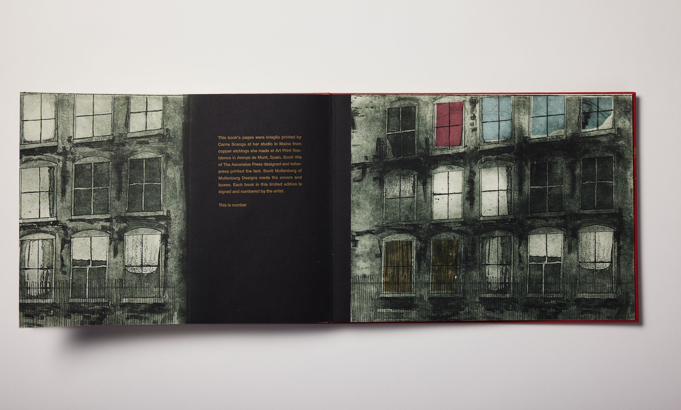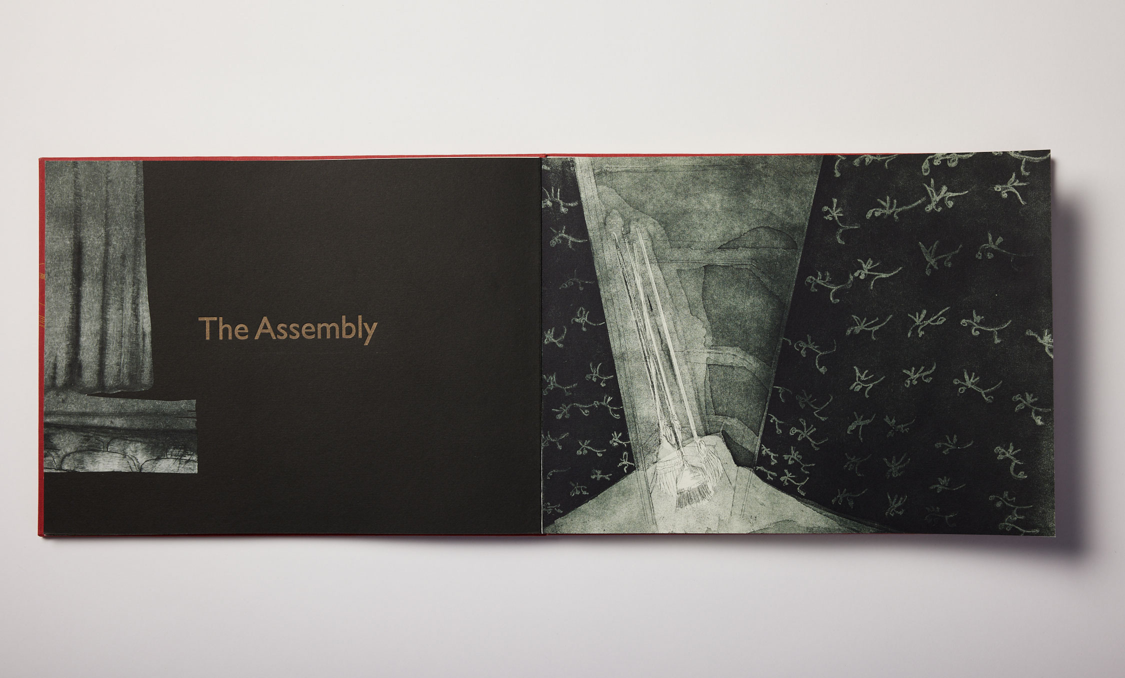The Assembly is an 11” x 14” accordion bound book, with a clamshell box. The book’s covers and box have decorative foil stamping. The pages of the book are all printed from copper etchings made at Art Print Residence in Arenys de Munt, Spain and then printed in my studio in Maine.