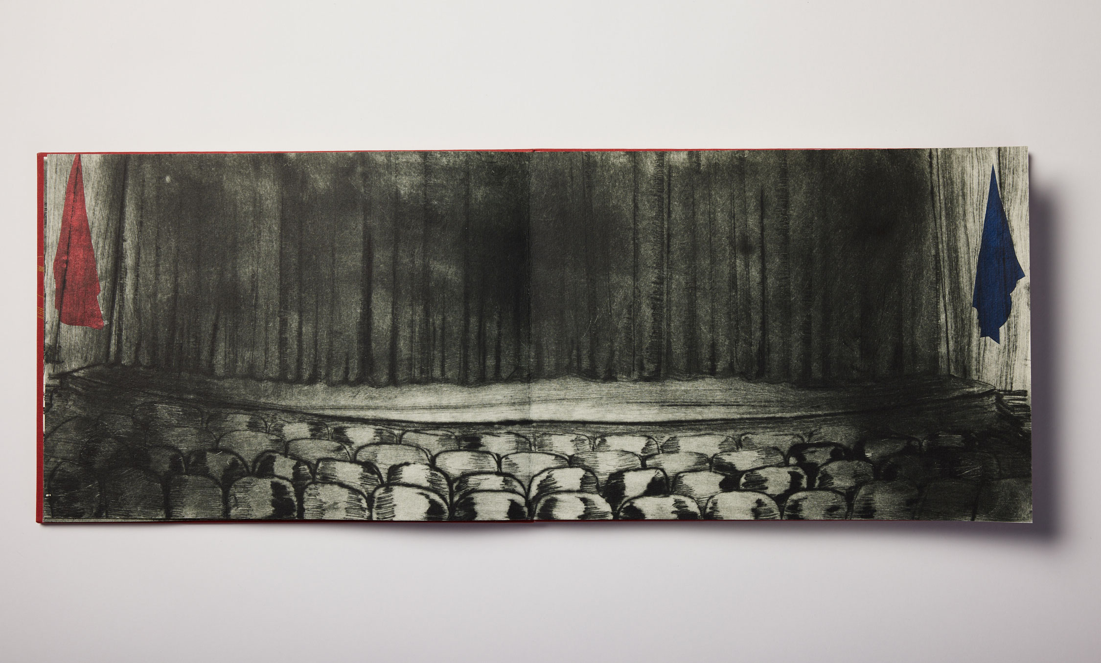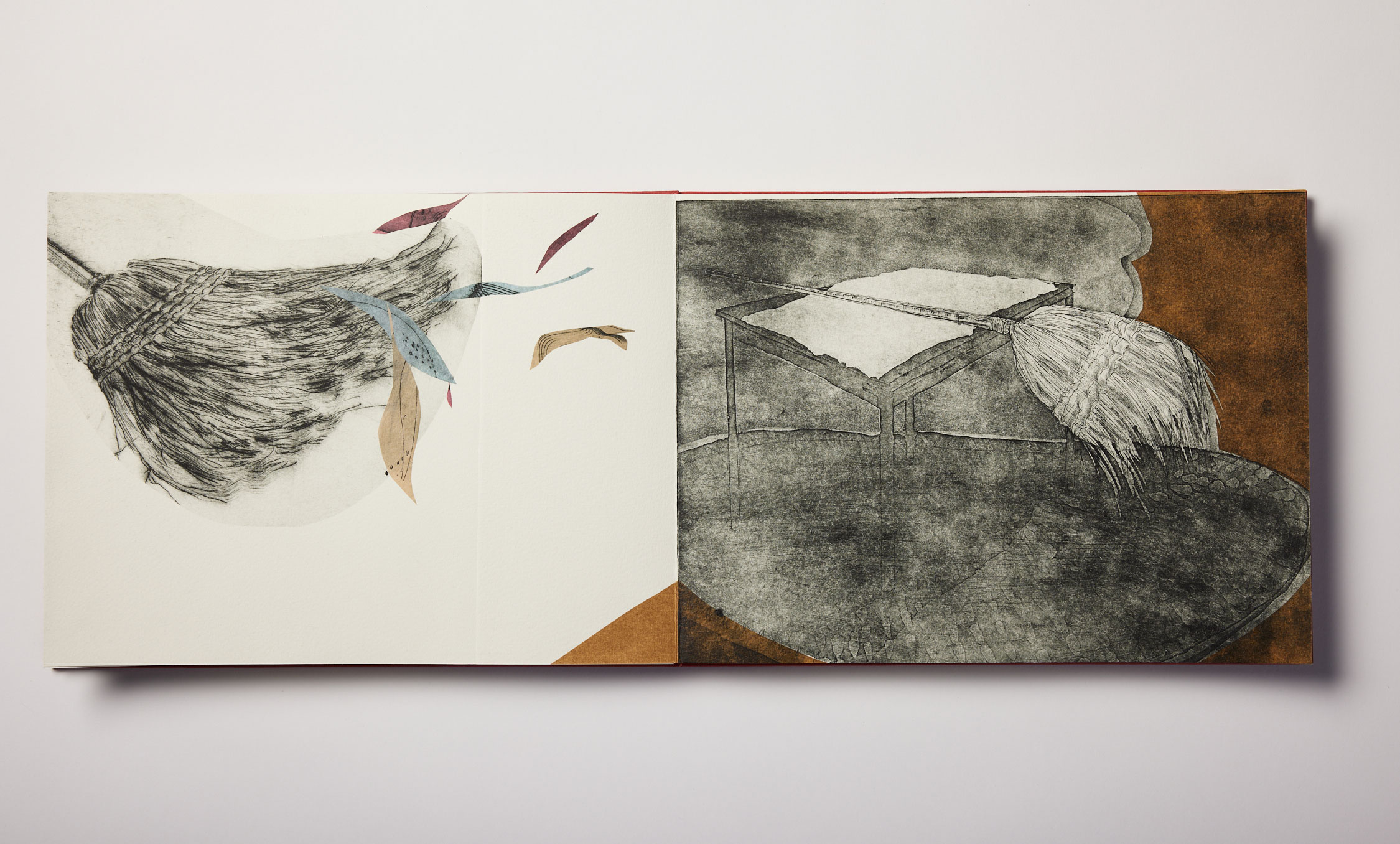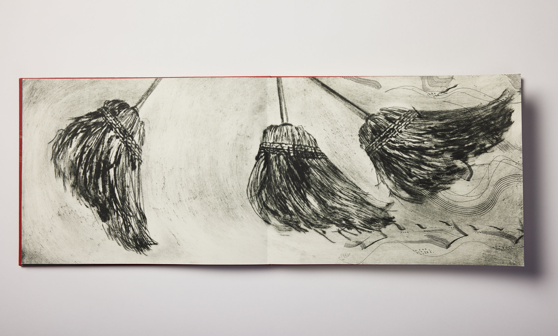 The Assembly explores the charged aura of the public arena in our time of surveillance, while hinting at the vibrancy that persists in secret places, hidden thoughts and unseen acts. The dark intaglio printed pages of this accordion book read as a haunting scene of a school assembly devoid of people. Turning the pages, the viewer engages in a hunt for the action, but it seems to always be just out of view. Then, from backstage, a fantastical broom sweeps joyously through multiple page spreads, flitting up debris, and offering a source for a visual motif recurring throughout the book. The scale of the broom and its gestural composition let the reader lay claim to the agency of irreverent play in the dark behind the stage. The final page shows the windows with curtains, assuring the reader that no one saw as they let themself be swept away.