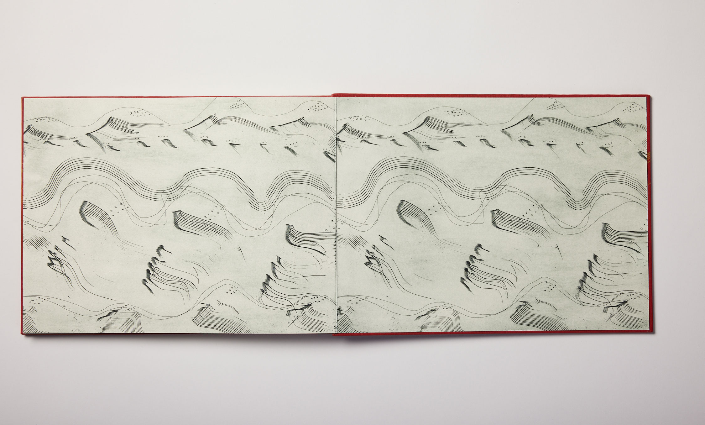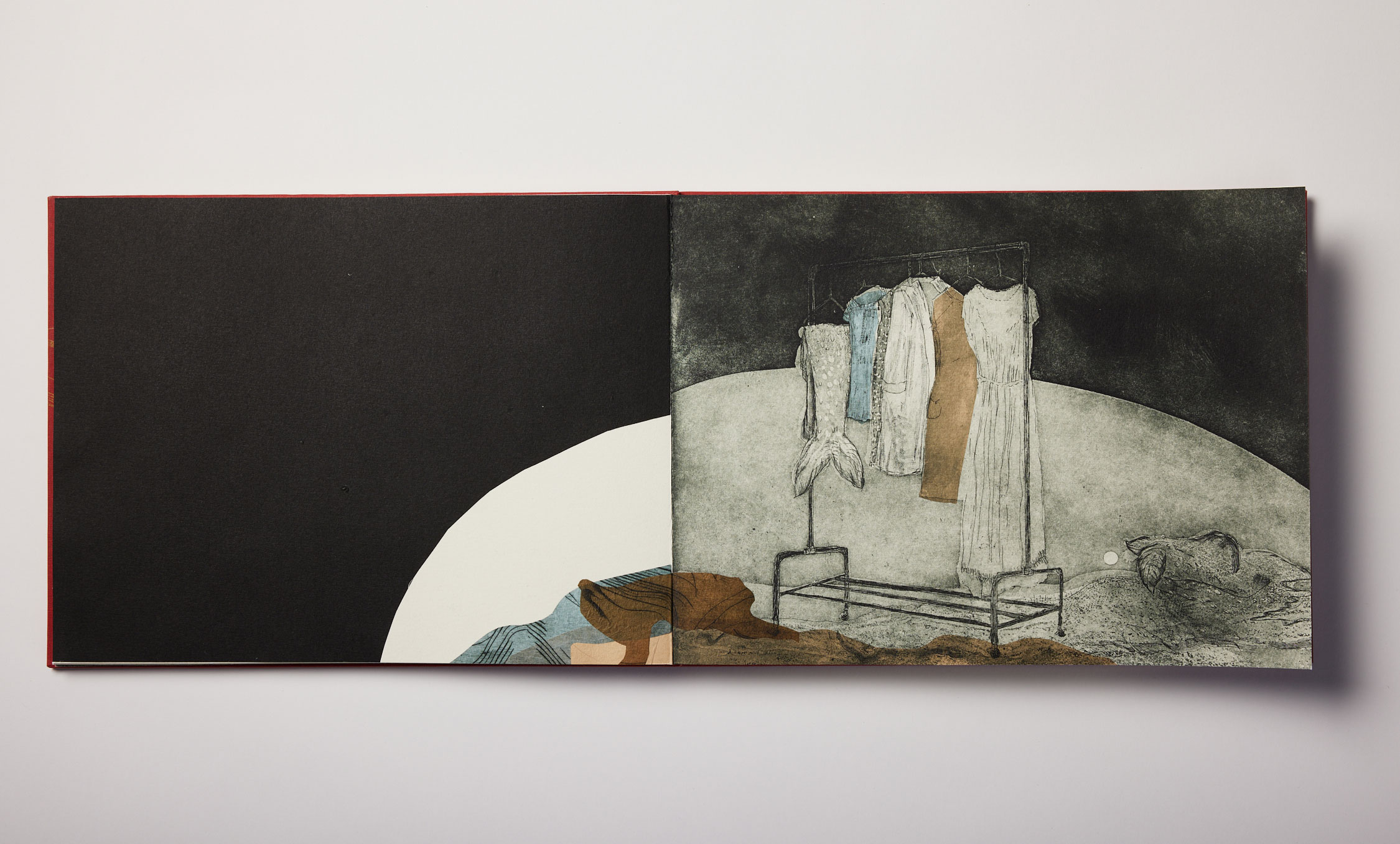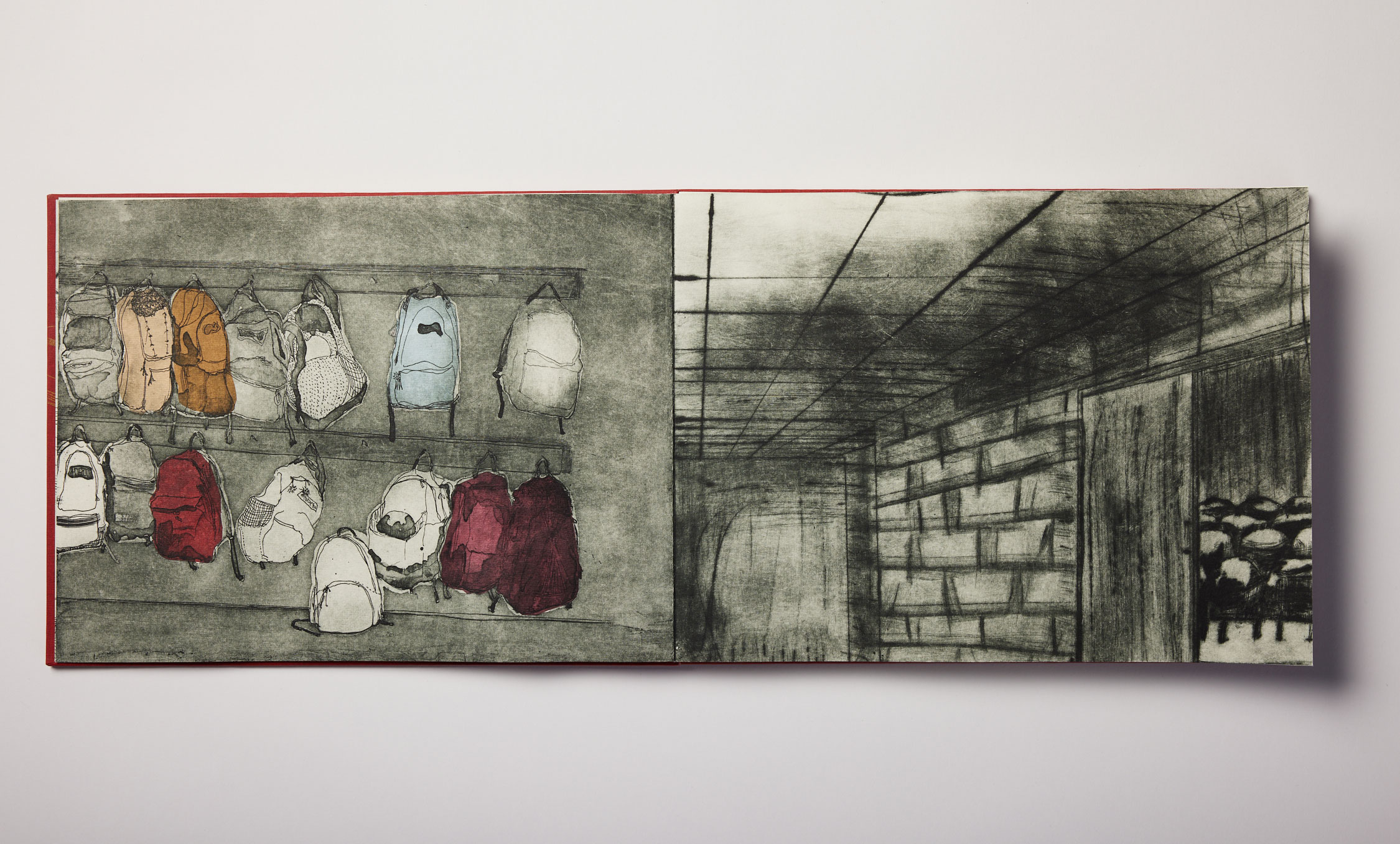 The Assembly explores the charged aura of the public arena in our time of surveillance, while hinting at the vibrancy that persists in secret places, hidden thoughts and unseen acts. The dark intaglio printed pages of this accordion book read as a haunting scene of a school assembly devoid of people. Turning the pages, the viewer engages in a hunt for the action, but it seems to always be just out of view. Then, from backstage, a fantastical broom sweeps joyously through multiple page spreads, flitting up debris, and offering a source for a visual motif recurring throughout the book. The scale of the broom and its gestural composition let the reader lay claim to the agency of irreverent play in the dark behind the stage. The final page shows the windows with curtains, assuring the reader that no one saw as they let themself be swept away.